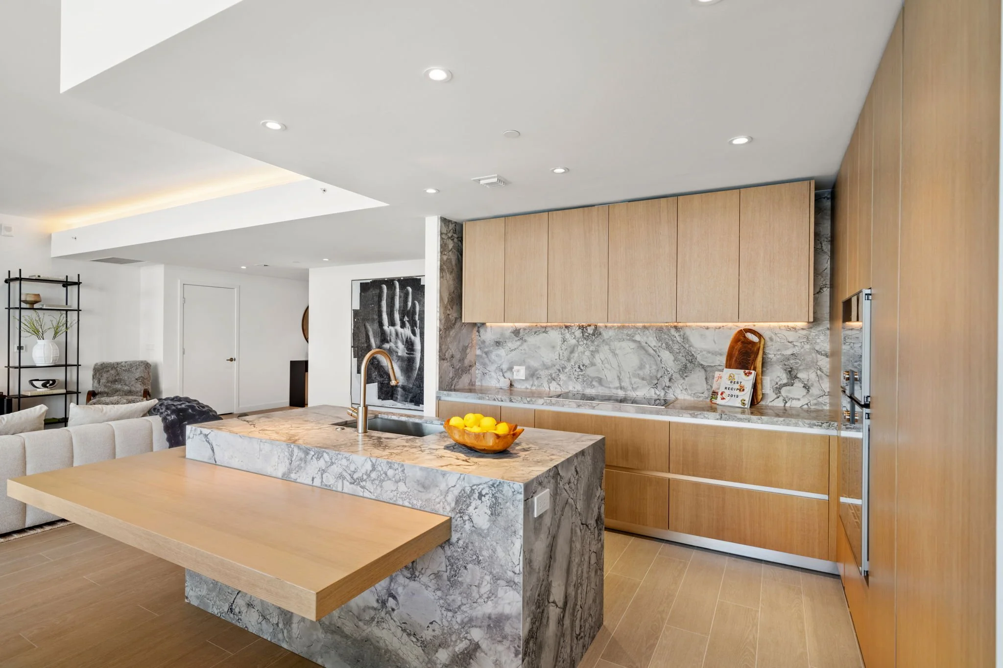 The home features three spacious bedrooms and four full bathrooms, each crafted with refined finishes. An open living and dining area connects seamlessly to the terrace, showcasing stunning views of the bay, ocean, and park. The gourmet kitchen includes premium appliances, custom cabinetry, and a functional layout ideal for both casual meals and entertaining.